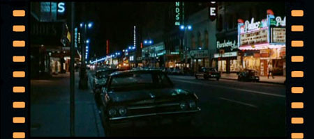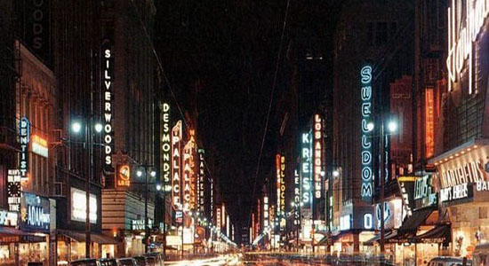 The photo on the left is of Broadway around 1959. It was taken from around point C on the map looking towards 7th St.